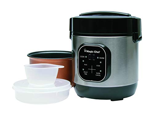 - Rice cooker with 3-cup capacity includes measuring cup and scoop