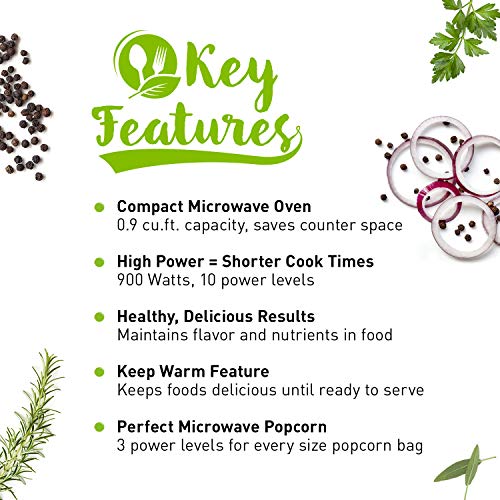 - Compact Microwave Oven, Easy Clean Interior, Popcorn Button, Child Safety Lock, and Auto Defrost, 0.9 Cu. Ft, 900W