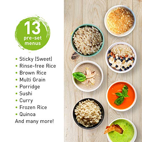 - 13 Pre-Set Cooking Programs: Automatically cook a variety of rice including delicious regular, quinoa, quick, mixed, sticky, rinse-free, brown rice, sushi, frozen rice and more