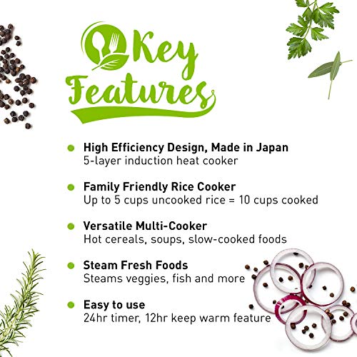- Additional Features: Built-in umami-enhancing taste catcher, 12-hour keep warm feature and 24-hour timer; Gourmet accessories include adjustable steaming basket, rice scoop, cereal scoop and measuring cup